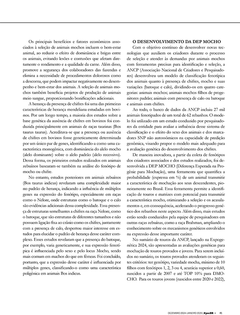 A edição de dezembro de revista Pecuária Brasil traz um artigo do pesquisador sênior da ANCP, Fernando Baldi, sobre a DEP para caráter Mocho, lançada recentemente pela entidade. O modelo classifica os animais quanto à presença de chifres, mocho e suas variações (batoque calo). A solução tecnológica representa uma iniciativa importante para fomentar a criação de rebanhos mais produtivos e alinhados com as modernas práticas de bem-estar animal. Confira: