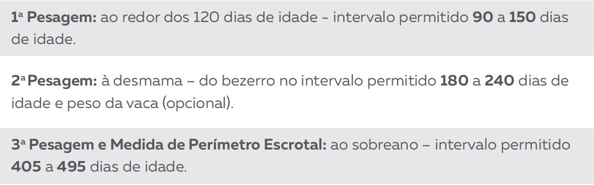 São 03 diferentes cronogramas de pesagens com 04 pesagens anuais cada. A fazenda deverá escolher entre uma das 03 opções para seguir e informar a Base de Dados da ANCP. São eles: